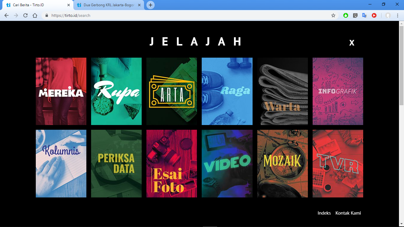 I thought the navigation of tirto.id is already good. There are 4 menus you can visit in the head bar Jelajah, Indepth, Mild Report, and Current Issue. You can search specific news if you click the search icon and you can see their news spotlight in the right corner of the head bar. You can even see breaking news below the header. If you scroll down, you will see the content of said menu plus more content like Infographic, Hard News, Esai Foto and Video.
